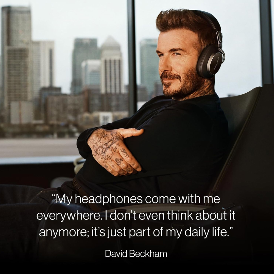 La vida de David Beckham transcurre entre las exigencias del trabajo y los viajes. En cada momento, sus auriculares Bowers & Wilkins Px8 S2, confeccionados con suave cuero Nappa y aluminio macizo fundido a presión, ofrecen un sonido preciso e inmersivo con una comodidad duradera.