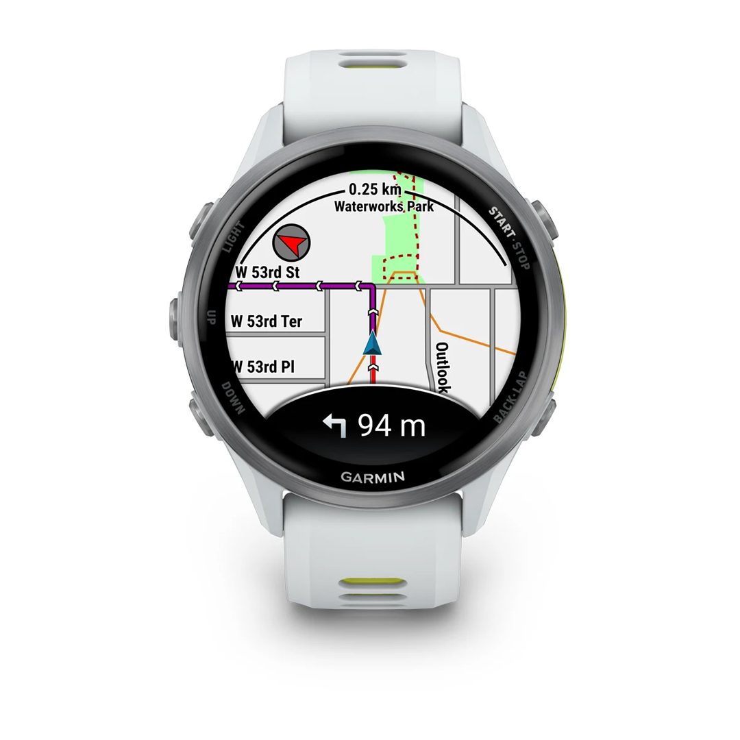 Tanto si sales a correr por las calles de la ciudad como si lo haces por pistas muy arboladas, el smartwatch Forerunner 970 proporciona mapas integrados a todo color, que ahora son incluso más dinámicos, intuitivos y fáciles de seguir.
