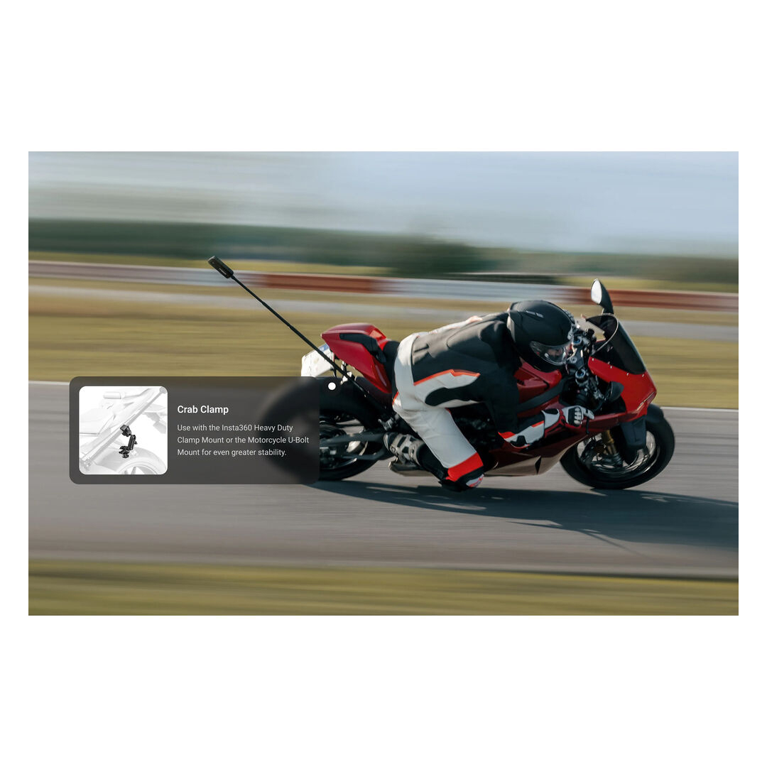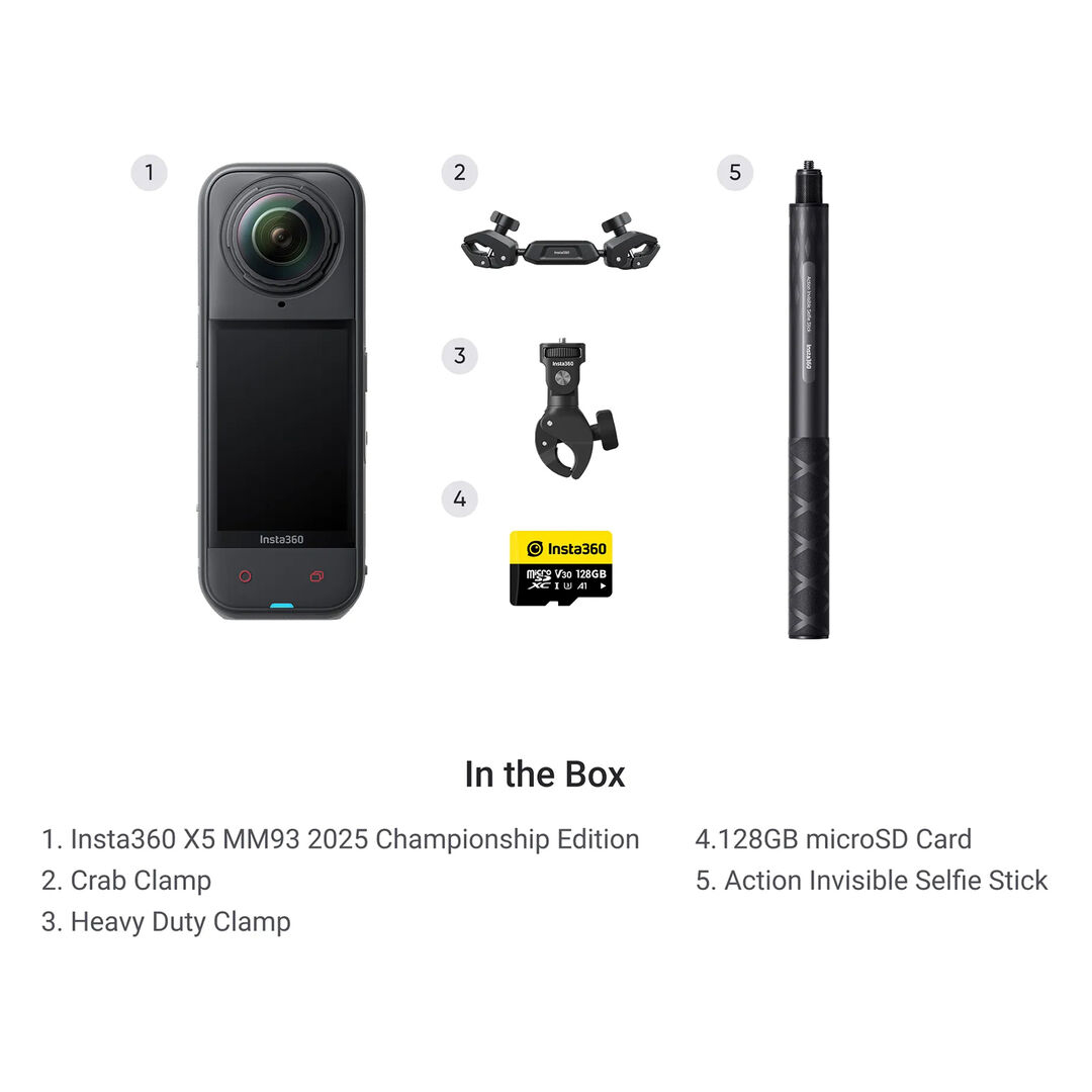 La edición MM93 2025 Championship incluye la cámara X5, el Action Invisible Selfie Stick, la abrazadera Heavy-Duty, una crab clamp, una tarjeta microSD de 128 GB y una suscripción de 1 año a la nube de 1 TB.